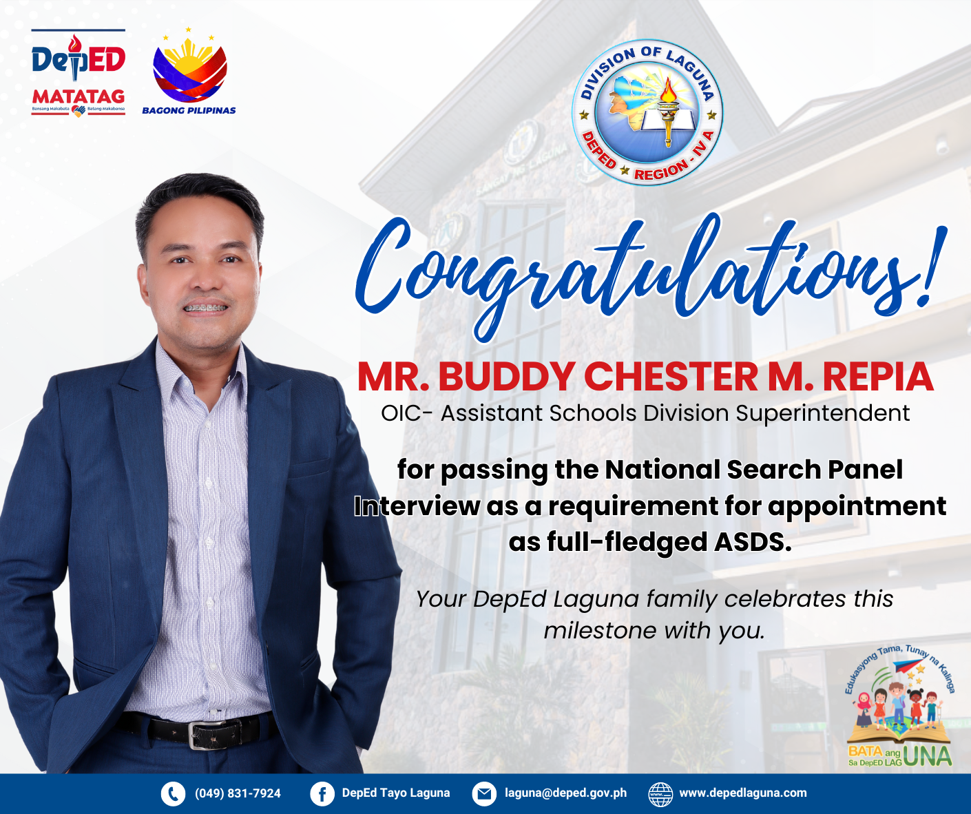 Congratulations! Sir Buddy Chester M. Repia, OIC-ASDS for passing the National Search Panel Interview as a requirement for appointment as full-fledged ASDS. Your DepEd Laguna family celebrates this milestone with you.