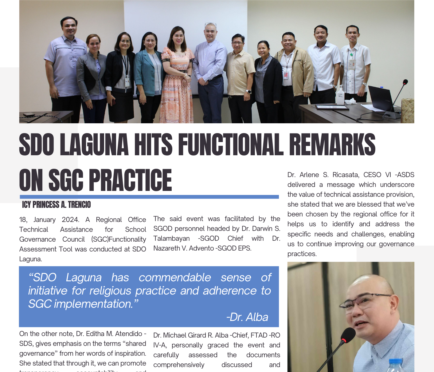 January 18, 2024. A regional office technical assistance for School Governance Council (SGC) functionality assessment tool was conducted at SDO Laguna. The said event was facilitated by the SGOD personnel headed by Dr. Darwin S. Talambayan- SGOD Chief with Dr. Nazareth Advento – EPS SGOD Laguna.