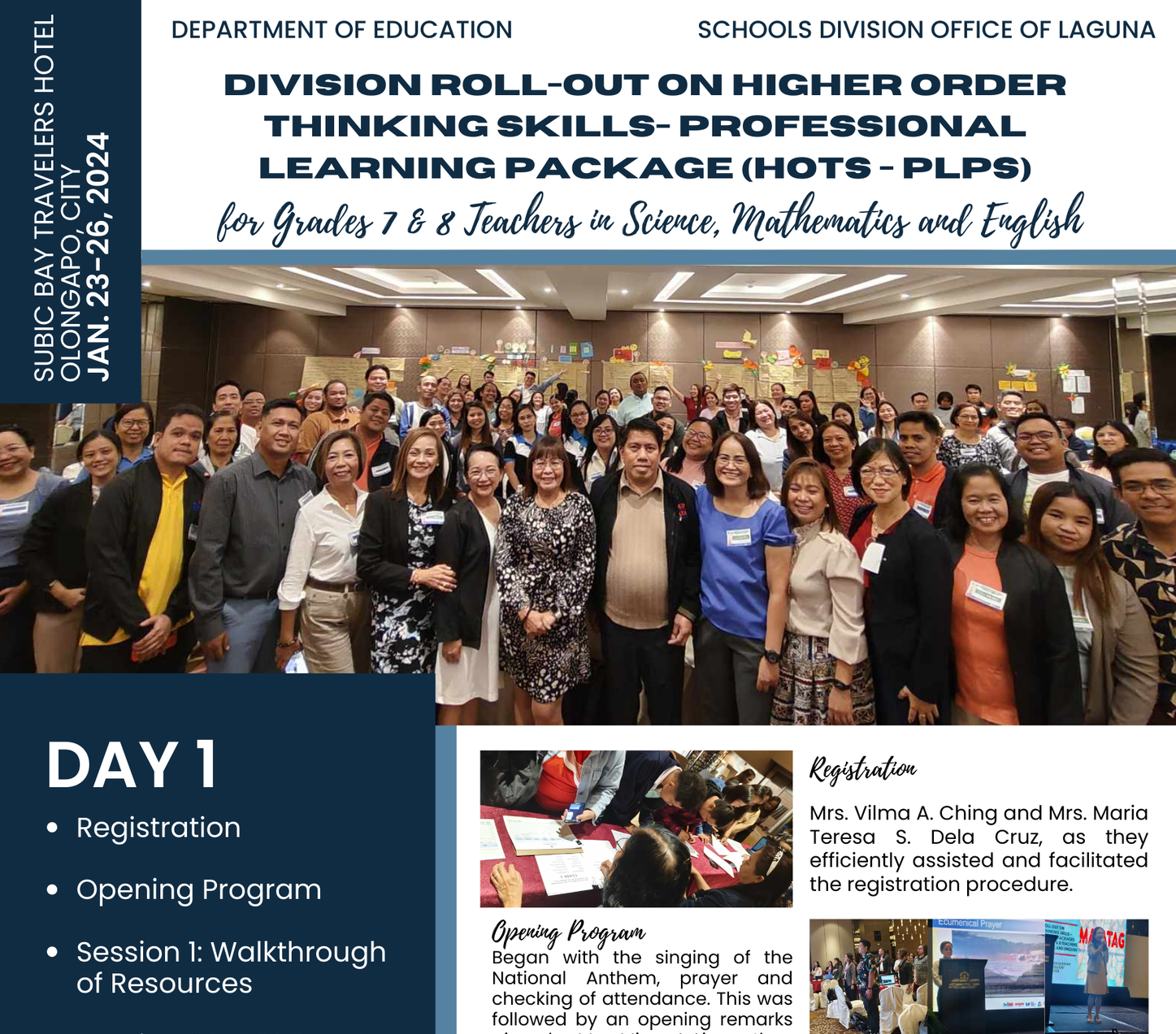 Day 1 of 3 of the Division Roll-Out On Higher Order Thinking Skills Professional Learning Package (Hots-PLPs) For Grades 7 And 8 Teachers In Science, Mathematics And English at Subic Traveler’s Hotel, Olongapo City. January 23, 2023