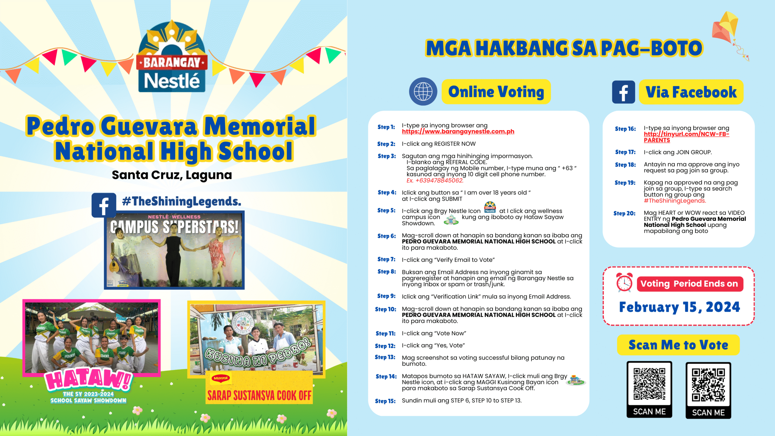 Relative to the partnership between the Department of Education and Nestle Phil. Inc. – through Greatfil Team Inc., Pedro Guevara Memorial NHS will represent Region IV-A CALABARZON in national level on Hataw: School Sayaw Showdown, Sarap Sustansiya Cook-Off and NWC Superstars contests in the Nestle Wellness Campus Program. In relation to the said program, this office encourages all teachers, parents and Senior High School learners (18 years old and above) to support the school via continue reading : Brgy. Nestle Wellness Campus Program Online Voting Procedure